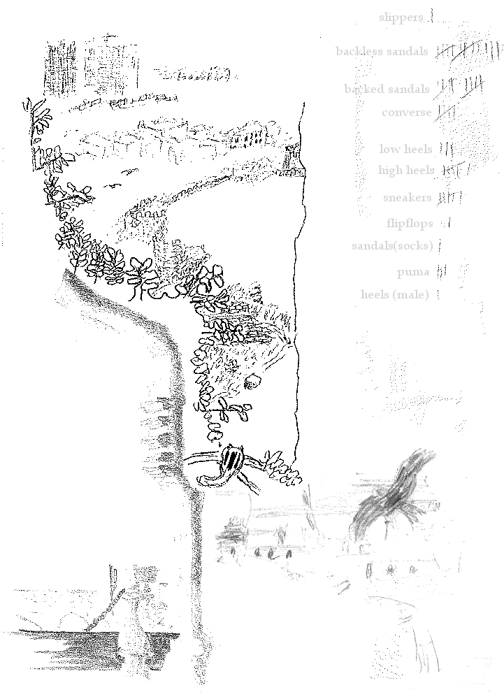 Neighborhoods sweep by.  A palace, it seems, for the local Congress party.  Stores of every description.  Restaurants, homes.  Streets, avenues, alleyways.  Time passes, the man gets off, I remain.  Eventually we cross a river, pass what seems likely to be the Salar Jung museum, a comforting omen for my half-imagined day trip.  Up the hill, writing in arabic again, banners for muslim parties, women everywhere more covered.  Eventually a station.  I’ve seen no tall four-masted building adrift in a rotunda, but the sun tells me that it’s behind me, and that I should change my shirt.  I ignore both suggestions, find the legendary Pista House, self-proclaimed largest Haleem seller in the world.  I am told lunch has yet to begin, buy a pizza crust, strike out for the Char Minar.  The pizza crust is sweet, but the road is warm, the traffic light, the building tall.  I make my way up an interminable spiral staircase, past a still-young woman who’s nevertheless surrendered to gravity, reach the lower gallery.  Around me, a city.  I walk back.  The broad streets, tin roofs, the press of largely black-clad pedestrians, the riot of shop signs and satellite dishes, the preponderance of black dress on the streets all remind me of the view from above the Damascus Gate.  It’s hot, so I sit down in the shade next to some middle-aged woman, offer her of my water and bread, am offered solitude in exchange.  People walk back and forth.   I sit, low, look at their shoes, start a tally to see what they’re wearing, my silly linear concept of modesty forever surprised to find women in burkas wearing shiny heels, even low ones.  And why not?  I sketch some of the archway to pass the time as shoes pass me.  Children arrive, curious to see my drawing, and leave indifferent.  Eventually I rise, walk to the exit, find it’s  been jammed with pedestrians and isn’t moving.  Laugh, because it is both surprising and expected.  Sit, wait until another exit is opened and the queue to recede, recede with it.