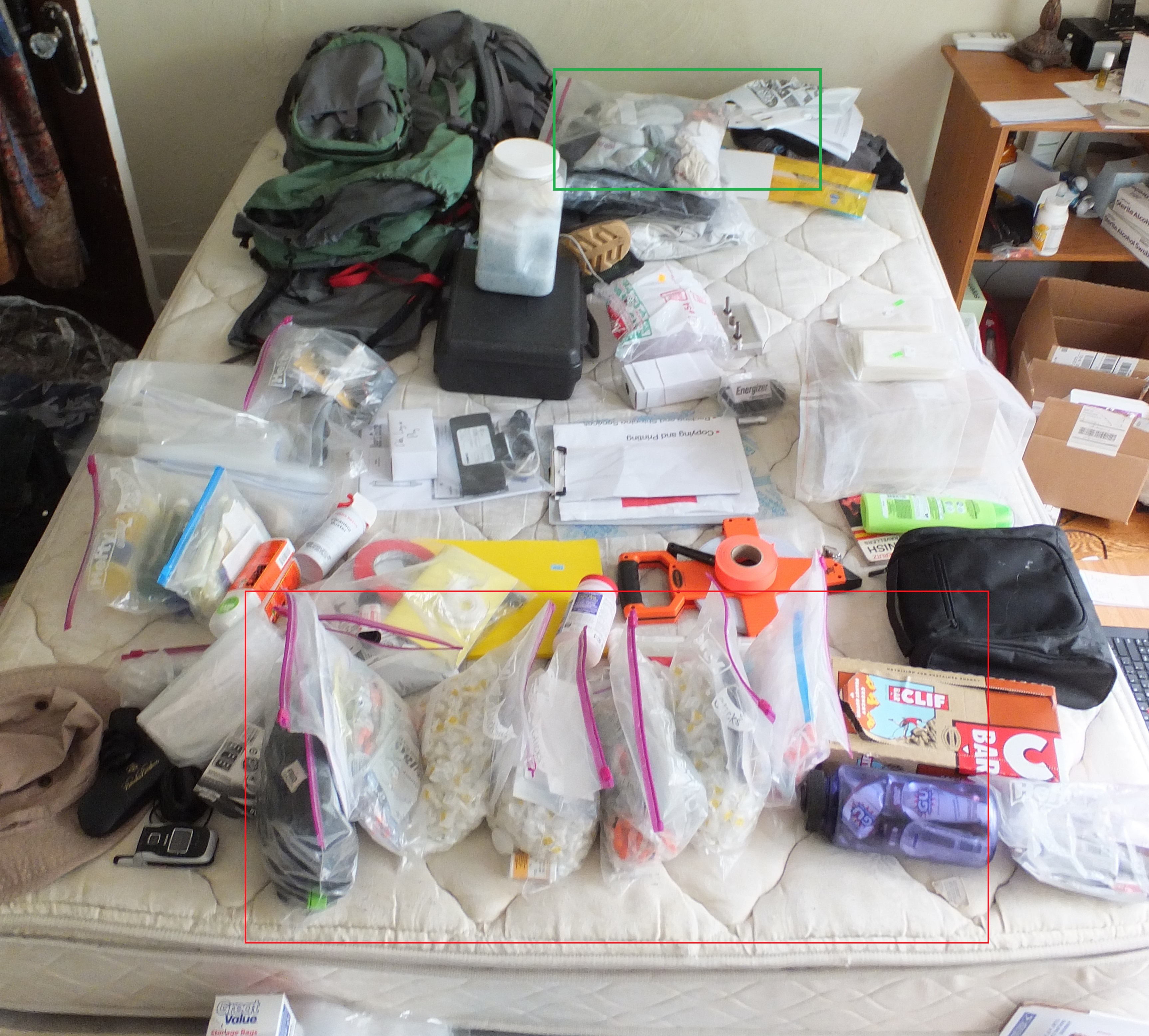 The red and the green rectangles outline my diabetes supplies and my clothes, respectively. Diabetes supplies are aggravatingly bulky. Fortunately, they’re also relatively light and are (mostly) consumed over the course of a trip. Everything else was field supplies of one sort or another and therefore completely non-negotiable, as were the diabetes supplies.