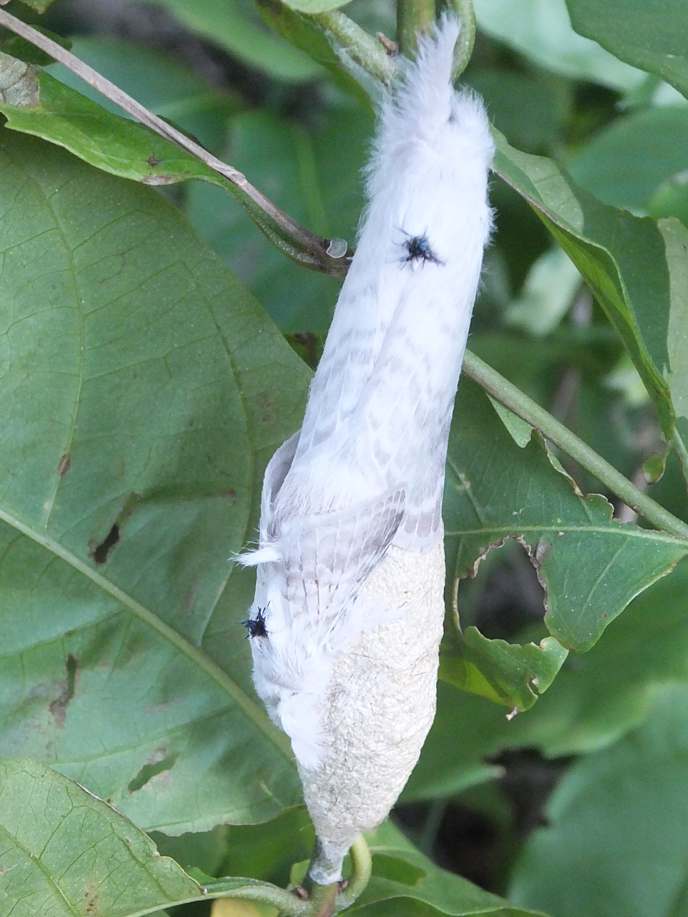 Most moths and butterflies have very complex lock-and-key genitalia, so I”m not sure how easy it would have been to dislodge the first moth. At any rate, it seemed rude to try, and I kept my hands to myself after that. The final piece of white in the picture is a cocoon, which one of the moths must have recently emerged from.